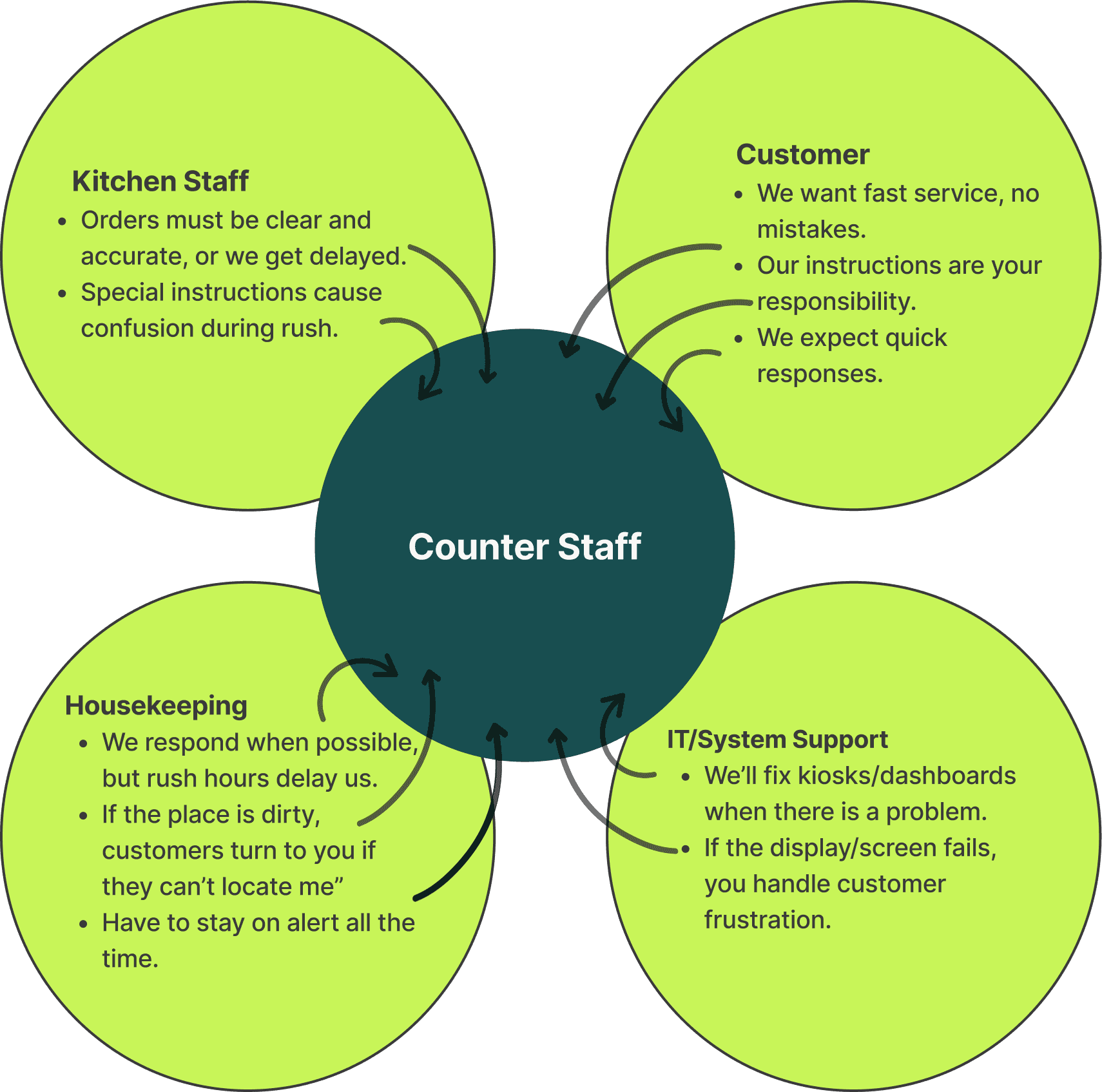 priorities among counter staff, kitchen staff,